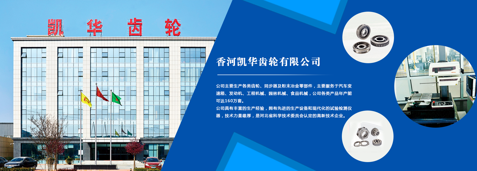 香河凱華齒輪有限公司是一家民營(yíng)企業(yè),位于香河經(jīng)濟(jì)開(kāi)發(fā)區(qū),毗鄰京津,交通便利。公司占地面積7萬(wàn)平米,注冊(cè)資本1360萬(wàn)元,現(xiàn)有員工400余人,其中技術(shù)質(zhì)量工程人員70余名,擁有中高級(jí)職稱(chēng)人員30余名。公司主要生產(chǎn)各類(lèi)齒輪、同步器及粉末冶金零部件,主要適配汽車(chē)變速箱與發(fā)動(dòng)機(jī),公司各類(lèi)產(chǎn)品年產(chǎn)能可達(dá)160萬(wàn)套。